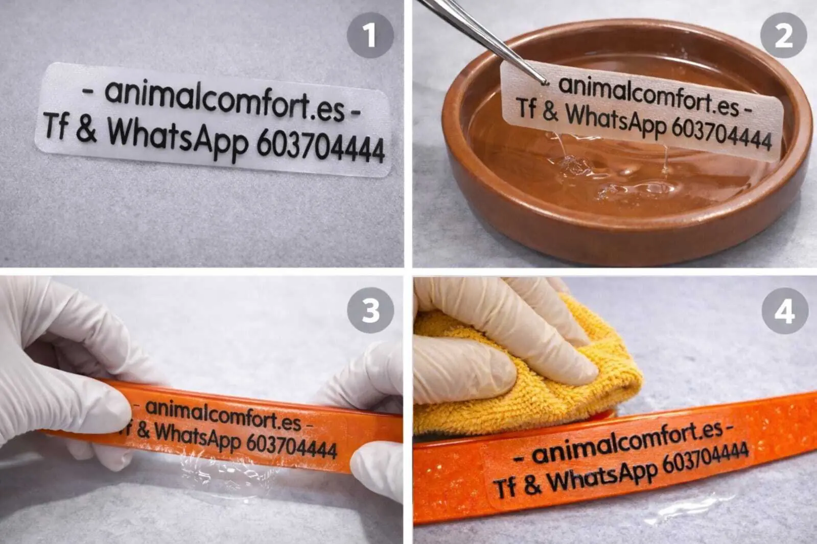 - Selecciona tu modalidad: Elige entre recibir las etiquetas sueltas con instrucciones de pegado profesional o envíanos tus collares para que nosotros realicemos el montaje o también, pídenos los collares con las etiquetas ya incluidas en este enlace.